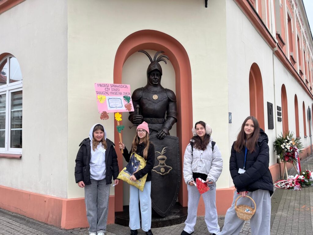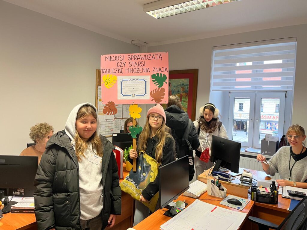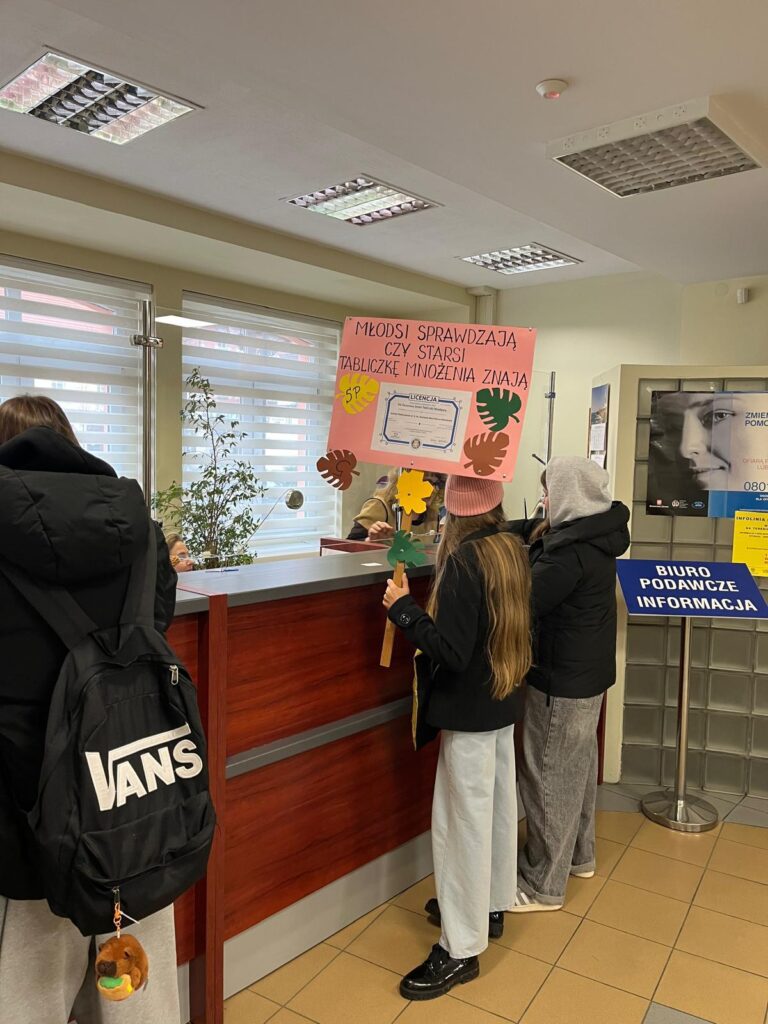 Asystenci sprawdzili również znajomość tabliczki mnożenia wśród dorosłych na rynku mikołowskim, pod hasłem „Młodsi sprawdzają, czy starsi tabliczkę mnożenia znają”. Odwiedzili m. in. Centrum Aktywności Społecznej, Urząd Miasta w Mikołowie, Miejski Dom Kultury. W zabawie bardzo chętnie wzięli udział mikołowianie, którzy w tym czasie spacerowali po ulicach miasta. Nasza szkolna komisja spotkała się z bardzo miłym i serdecznym przyjęciem ze strony mieszkańców Mikołowa. Każdy bardzo chętnie i z uśmiechem poddał się testowi z tabliczki mnożenia. Wszyscy, od najmłodszych do tych bardziej dojrzałych popisali się świetną sprawnością rachunkową. Uczniowie byli bardzo podbudowani otwartością i życzliwością ludzi. Zachęciło ich to do kontynuacji akcji w następnych latach. Już nie mogą się doczekać!!! Wszystkim, wspaniałym mikołowianom, których mieli przyjemność spotkać bardzo dziękujemy!