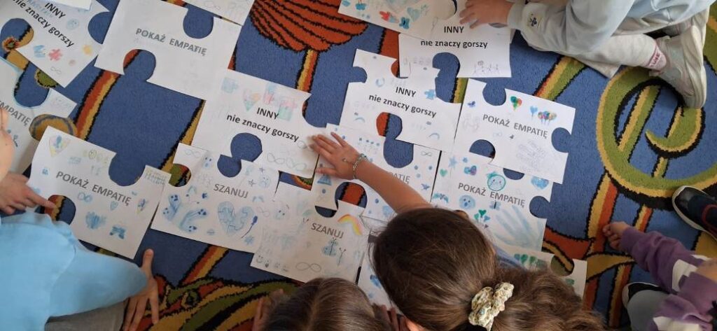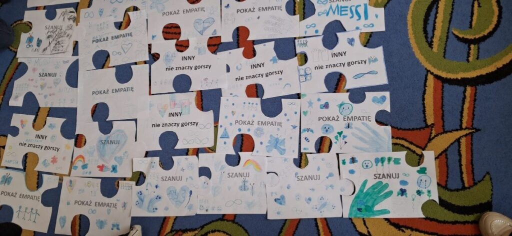 W szkolnym holu powstała wyjątkowa gazetka, do której uczniowie aktywnie się włączyli. Każdy mógł ozdobić przygotowane wcześniej puzzle z hasłami takimi jak „wspieram”, „akceptuję”, „rozumiem”, „inny nie znaczy gorszy”. Uczniowie wykazali się ogromną kreatywnością – pojawiły się symbole dotyczące autyzmu, m.in. kolorowe puzzle, znak nieskończoności, niebieskie motyle, złączone dłonie czy tęczowe motywy. Z pojedynczych elementów powstała piękna, wspólna praca, symbolizująca zarazem różnorodność i jedność.